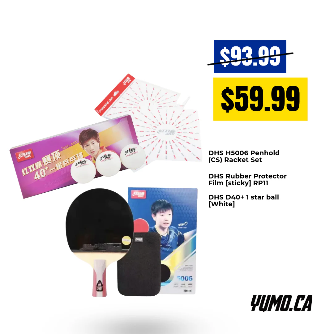 This bundle includes the high-performance DHS H5006 Penhold (CS) Racket Set, the protective DHS Rubber Protector Film [Sticky] RP11, and the durable DHS D40+ 1-Star Balls [White].