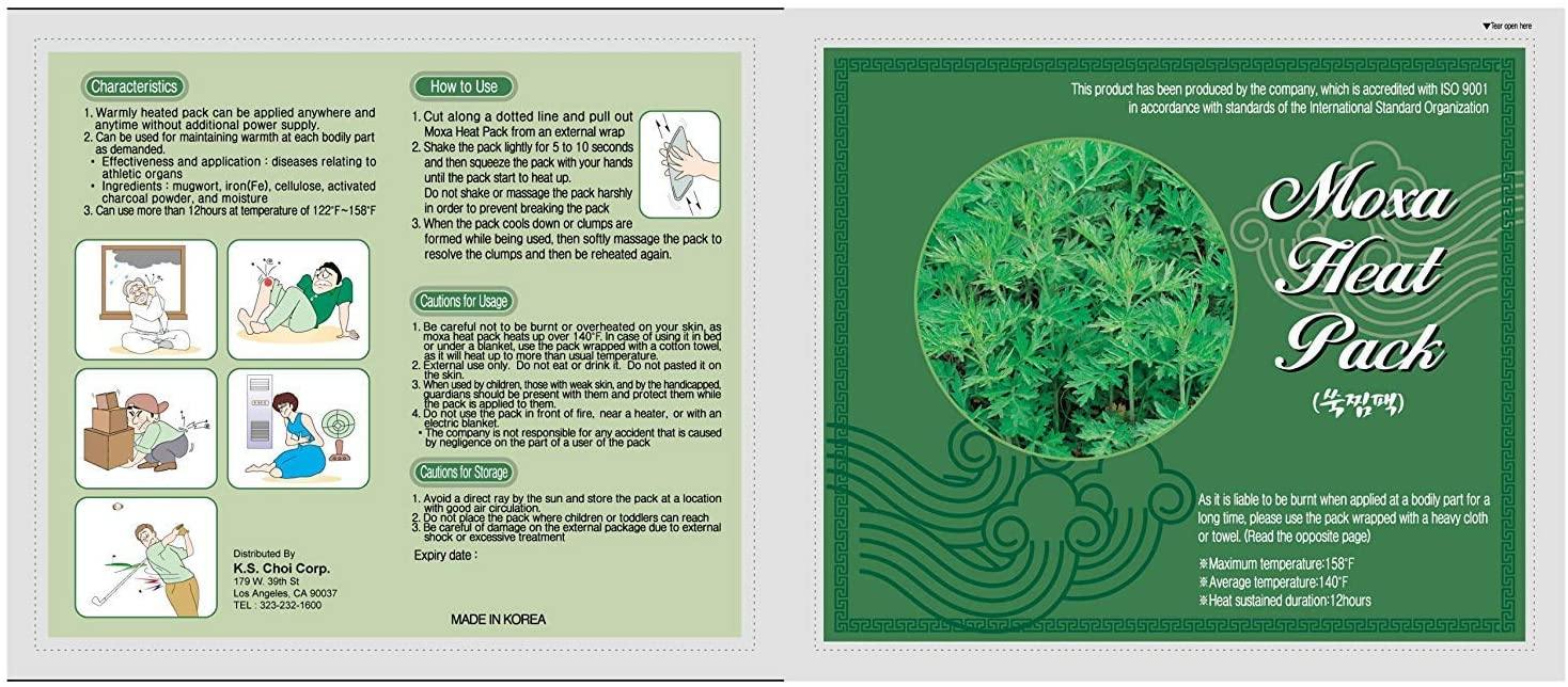 Contains: Mugwort, Iron (Fe), Cellulose, activated charcoal powder, and moisture. These packs produce no fire or smoke.