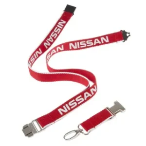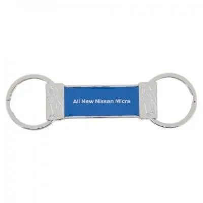 Stylish double sided metal keyring with All-New Nissan Micra wording in white, engraving in silver with blue central strip.